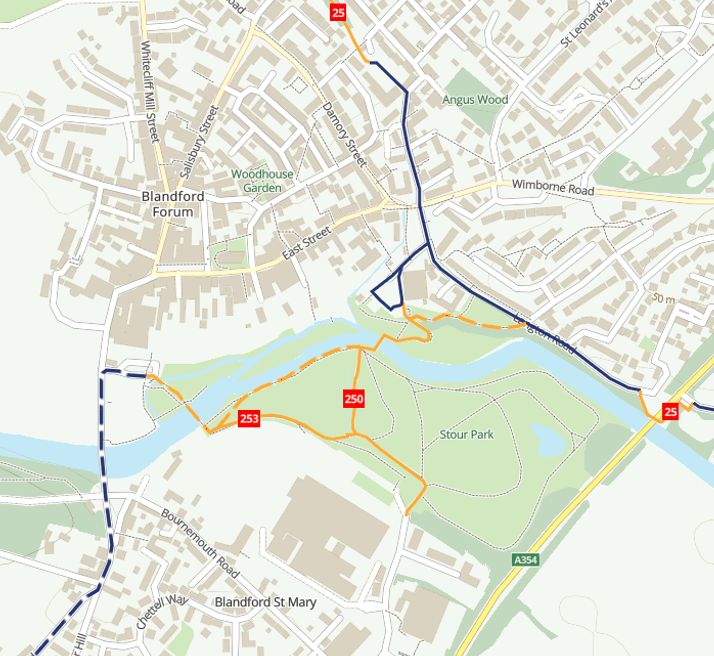 The National Cycle Routes 25, 250 and 253 are directly passing by your home and Blandford Frum and are easily accessible. The full route information can be found at: https://www.sustrans.org.uk/national-cycle-network