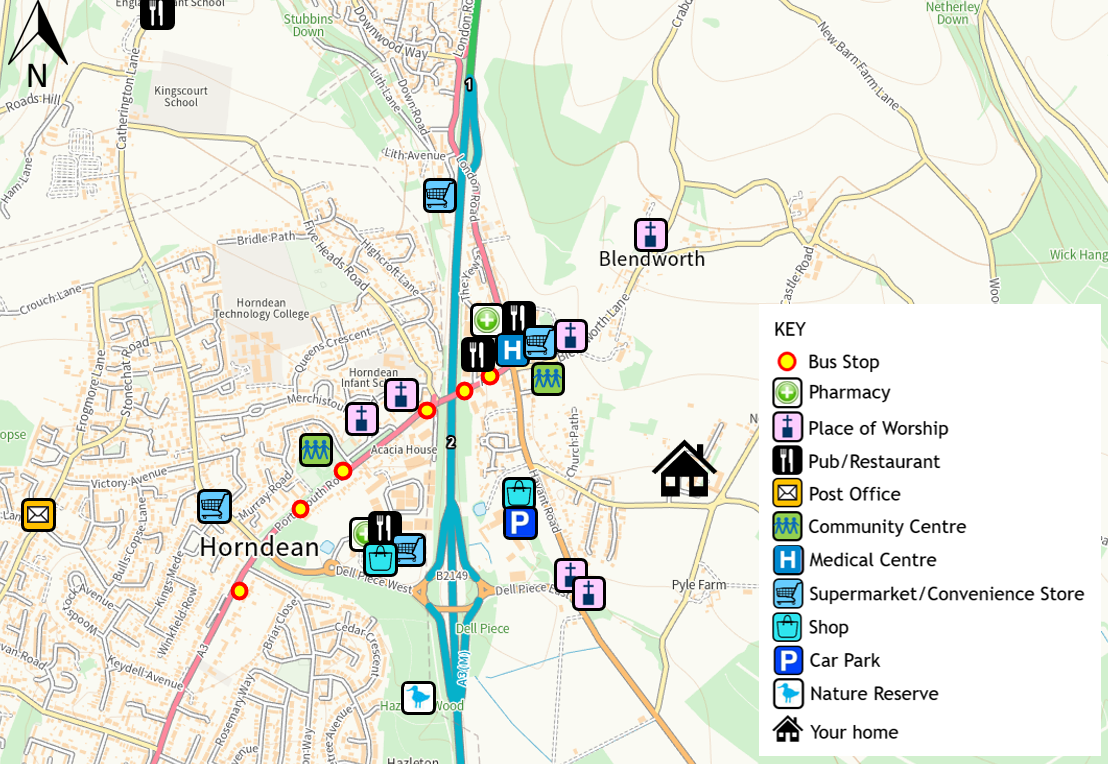 The centre of Horndean is approximately a 15-minute walk away, with a number of local facilities available (as summarised in the accessibility map below). This includes Keydell Nurseries, a pharmacy and a couple of restaurants and cafes. Further afield Waterlooville offers more town centre amenities and can be reached via the 8 The Star and 37 bus services.