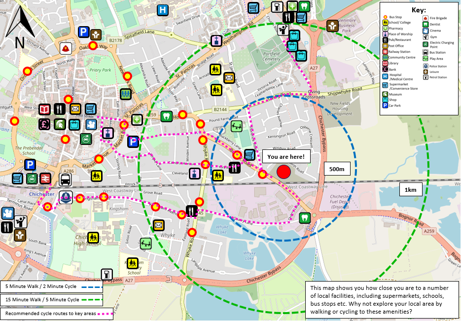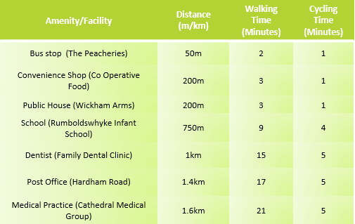 A range of amenities within your local area are easily accessible within both walking and cycling distances, Many can be found on in Chichester City Centre (17-minute walk).