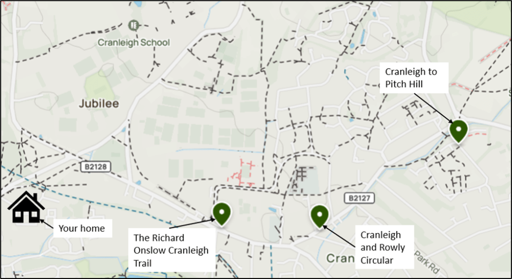 oCranleigh to Pitch Hill – can be accessed via a 42-minute walk or 11-minute cycle, or a 9-minute bus journey via the 42 bus service from Elm Park bus stop. A scenic route through grounds and woods.