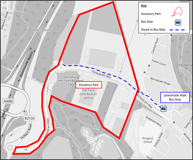 The closest bus stop currently to Dunsbury Park, is the Larkwhistle Walk bus stop, on Calshot Road. This stop is served by Stagecoach Route 22 which travels between Leigh Park and Havant Bus Station. Buses run approximately every 15 minutes all day and night (weekdays).