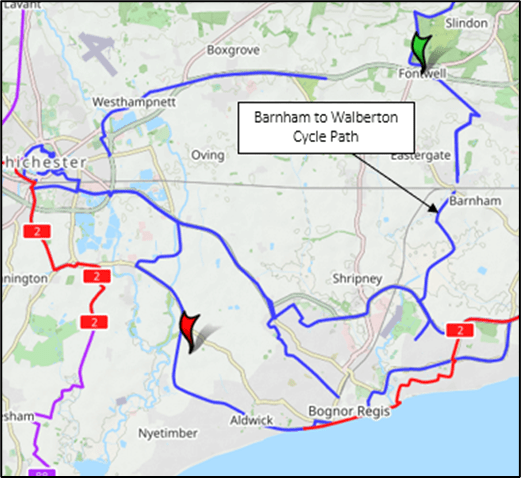 The cycle routes near your new home are presented below including local cycle route and National Cycle Routes (NCR). The local cycle route near your home is the Barnham to Walberton cycle path which is a 2km trail. This provides a connection near to the NCR route 2 near Bognor Regis. Route 2 also can be joined in Chichester. While route 88 runs from Chichester to West Dean.