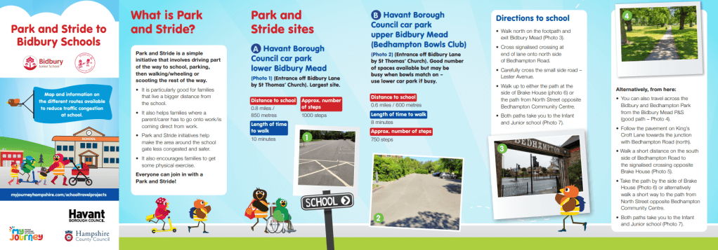 - Or at the end of Lower Road, turn right onto Bidbury Lane. When you see lower Bidbury Mead car park, you can follow the onward route options in the Park and Stride leaflet. (Note – although a quieter side street, there are sections on Lower Road and Bidbury Lane that have no pavement).