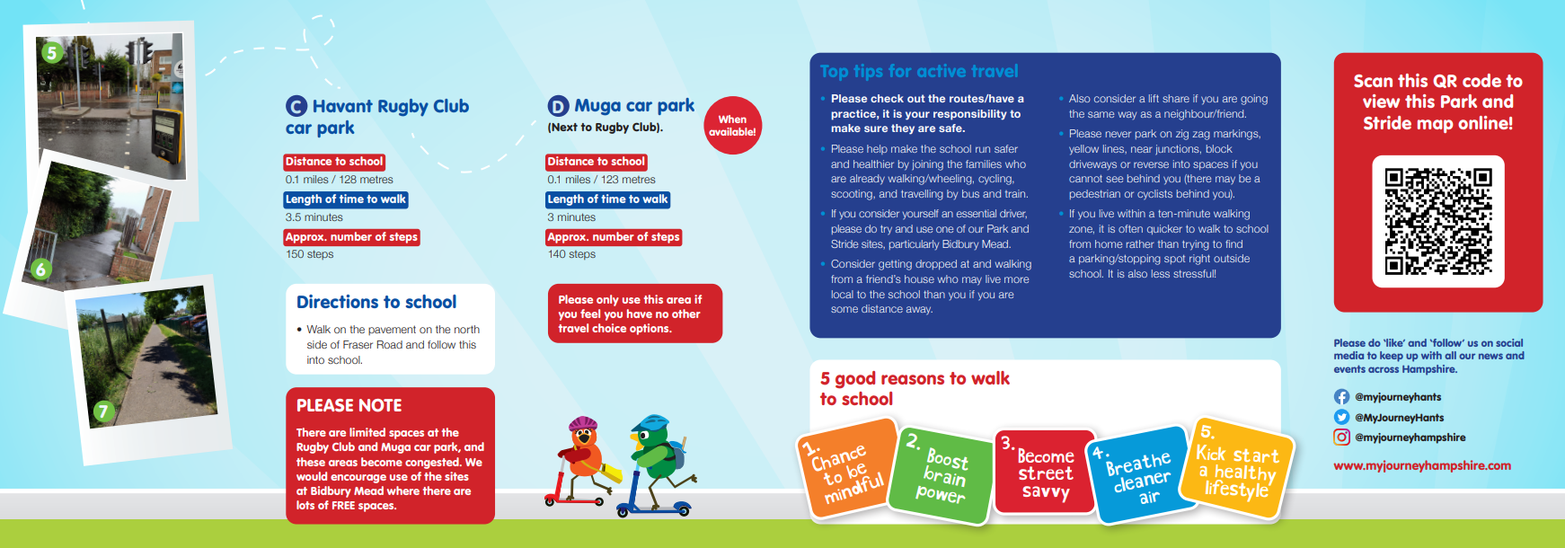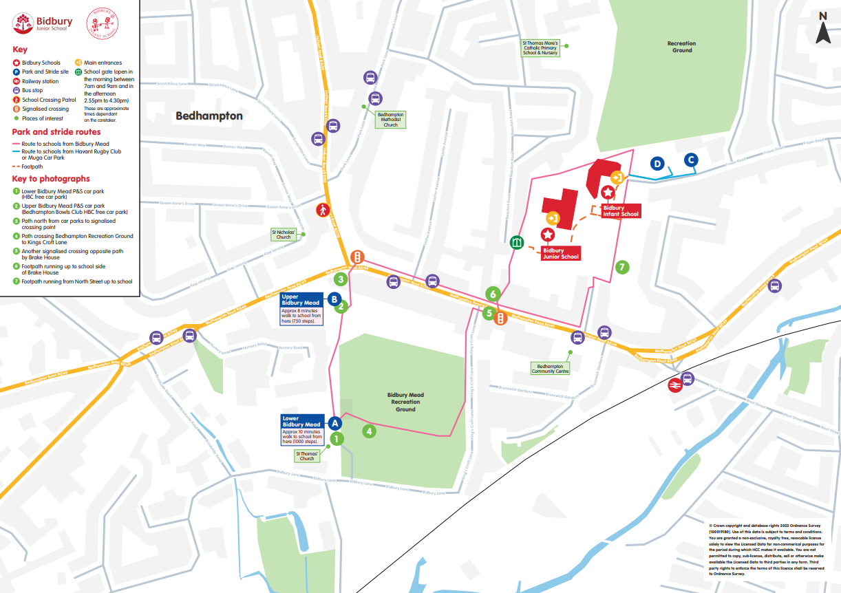 - Continue to walk on the north side of Bedhampton Hill. Cross at the junction with Portsdown Hill Road and continue on Bedhampton Road. Cross Hulbert Road using the signalised crossing point. Cross the small side street – Lester Avenue and then walk up to either the path at the side of Brake House or use the path from North Street opposite Bedhampton Community Centre. Both paths take up to the Infant and Junior school.