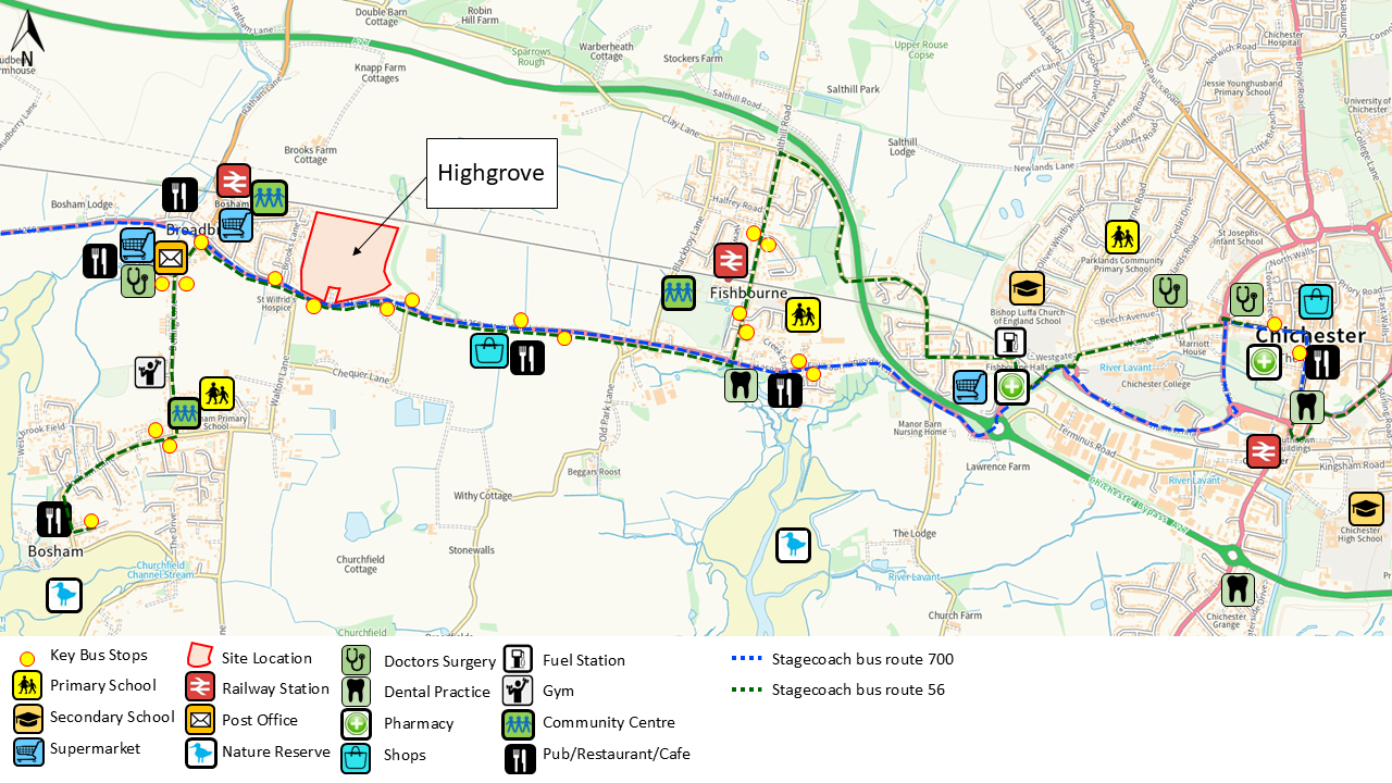 The 700 bus service runs between Portsmouth and Chichester, calling at the stops on Main Road outside Highgrove; with a service every 20-minutes Monday – Saturday, and every 30-minutes on Sundays.