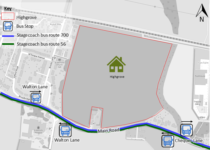 The nearest bus stops to you at Highgrove are on Main Road, these are the Walton Lane and Chequer Lane stops, as pointed out on the map below. There are 2 bus services for you to choose from depending on where you are going, both of which are run by Stagecoach bus company, and call at the Walton Lane and Chequer Lane stops.