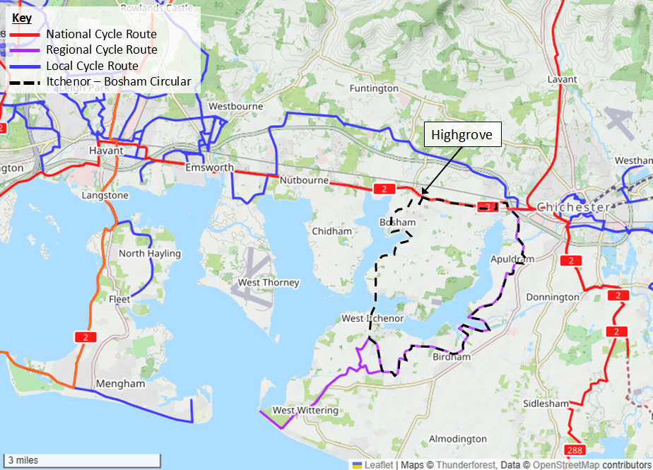 National Cycle Route (NCR) 2 runs east to west along Main Road right in front of your new home at Highgrove, using the shared footway/cycleway. The route runs from Dover to Exeter, but locally it connects you to Chichester, Havant, and beyond, with route details available from the website here and a summary shown on the map below.