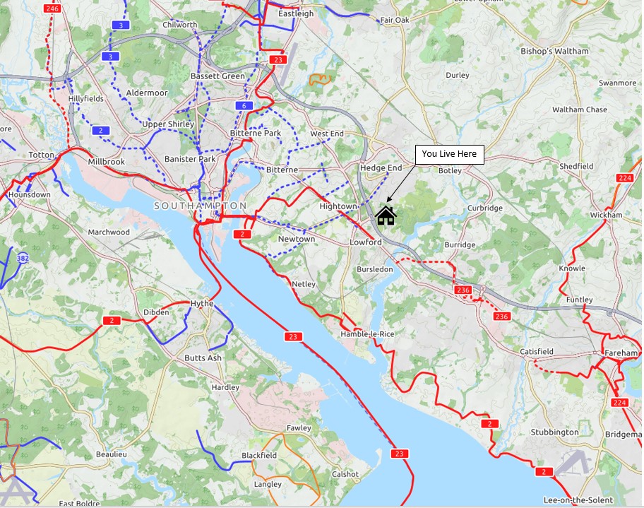 National Cycle Route 2 provides access to Portsmouth, Southampton and further west to locations such as Bournemouth and Swanage. Cycle Route 23 from Southampton travels to the Isle of Wight to the south and Winchester and Reading to the north. An interactive map of the local and national cycle routes are accessible via; https://www.openstreetmap.org/search?query=bursledon#map=10/50.8515/-1.1694&layers=C