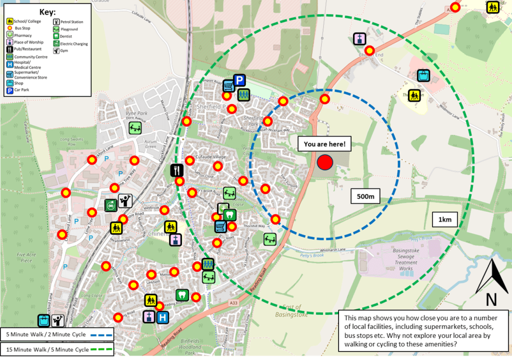 The accessibility map below should give you a rough idea about your closest bus stops, shops, local facilities and places of interest. Beyond this, your home is roughly 6km away from Basingstoke Town Centre which is accessible by an 18-minute cycle or a 35-minute journey using Stagecoach no.14.