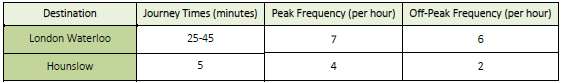 Feltham railway station is located approximately 1.5km (19-minute walk or 5-minute cycle) southeast of the site and can be accessed off Bedfont Lane. Feltham railway station is served by South Western Railway services with the table below summarising the direct services from this station. Further details on service timings and station facilities are available at https://www.southwesternrailway.com/travelling-with-us/at-the-station/feltham