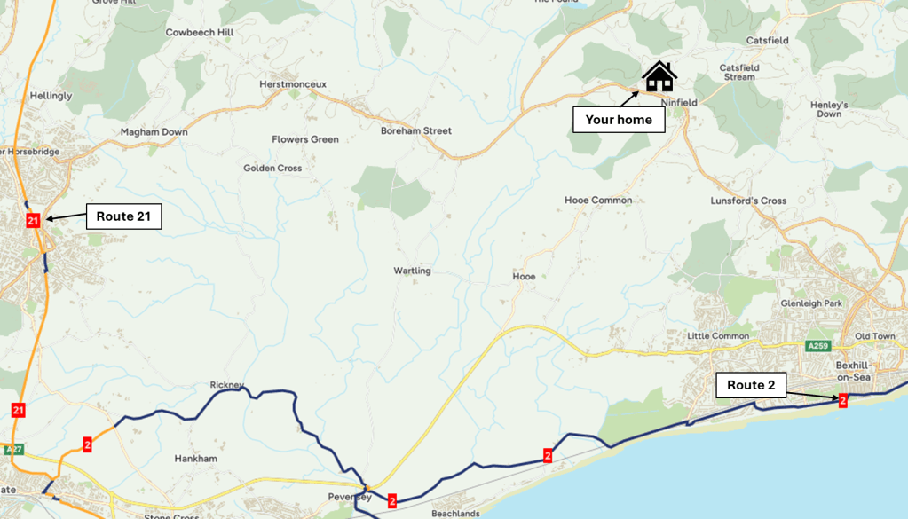 Your home is located near to National Cycle Network Route 2, which can be accessed to the south of your home near Bexhill, which is around an 18-minute cycle. NCN Route 2 is a long-distance route between Dover to St Austell, which in proximity to your home connects to route 21 near Eastbourne which provides a route to London. This is shown in the map below.