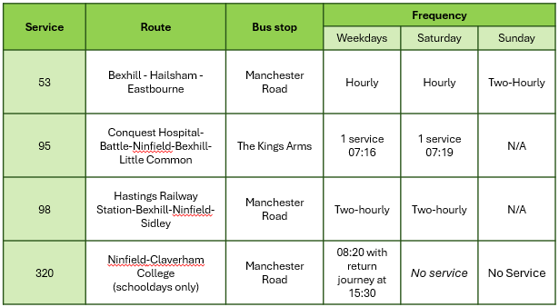 A service is provided every hour Monday-Saturday and every 2 hours on Sundays providing access to Bexhill, Hailsham and Eastbourne.
