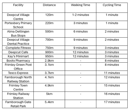 Mindenhurst is located near several facilities and amenities including bus stops, café, convenience store, pharmacy and Frimley Town Centre shown in the table below, reflective of their location. The table also shows the walking and cycling times.