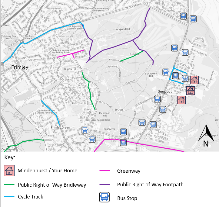 Mindenhurst is located near several facilities and amenities including bus stops, café, convenience store, pharmacy and Frimley Town Centre shown in the table below, reflective of their location. The table also shows the walking and cycling times.