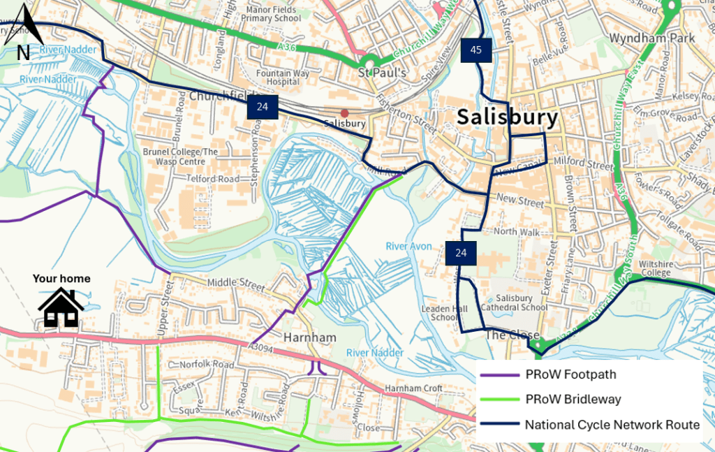 National Cycle Network Routes 24 and 45 can be joined in Salisbury town centre, with Route 24 providing a route northwest and southeast from your home, and Route 45 providing a route to the north.