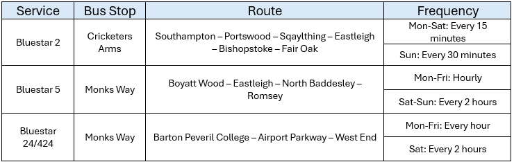 There nearest bus stops to you are from Chestnut Avenue (Cricketers Arms and Monks Way) and Stoneham Lane (Concorde Club and St Nicolas Church). The location of these stops is shown on the map below, whilst the table provides a summary of services available from these stops.