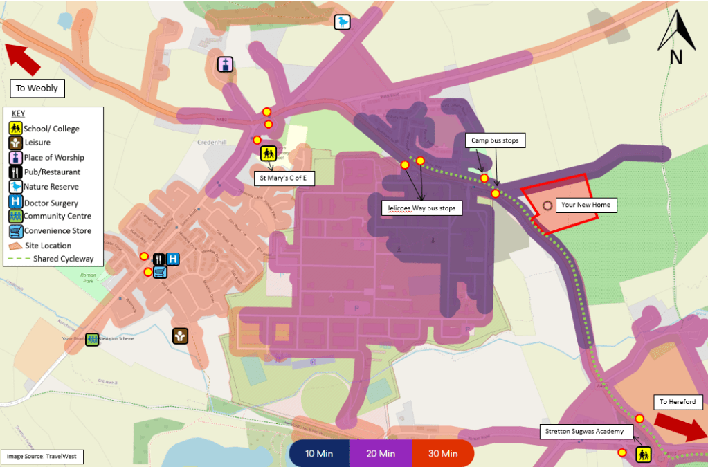 The local shops and facilities within Credenhill are predominately located along Station Road, an 18 – 30-minute walk from your new home. The local school is located at the top of Station Road (18-minute walk) whereas the Community Hall is located at the bottom (30-minute walk). In between, there are a handful of local amenities including a row of shops comprising a One Stop convenience store and a couple of food takeaways. Footways beginning within Oakfields are continuous to Station Road, with various dropped kerb facilities and a signalised crossing point along the route to help create a safe walking environment.