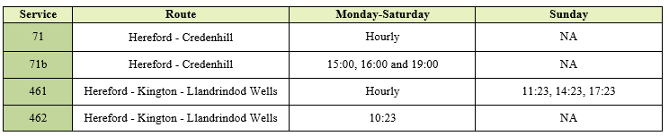 Credenhill’s bus operators are Sargeants Brothers. A summary of the routes and timetables are outlined below. Your Welcome Pack provides more detail regarding the departure times for the more regular 71 and 461/ 462 bus services.