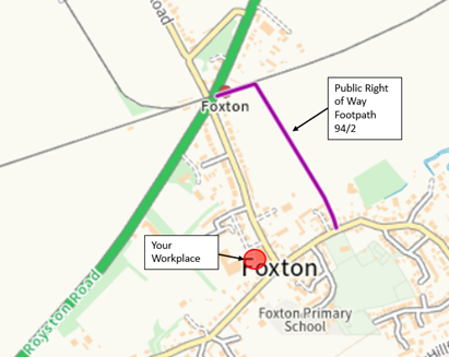 Below shows Public Right of Way Footpath 94/2 which is about 250m from your workplace, on High Street, and meets at Station Road, by Foxton Rail Station. This could potentially be an ideal walking circuit on your lunch break!