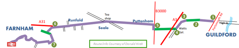 Guildford is part of Route 22 of the National Cycle network which when complete will connect London with Portsmouth, then Brockenhurst via the Isle of Wight. The route to Farnham station is 11.5 miles from Guildford High Street. Mostly this route follows quiet roads and countryside tracks. There are steep climbs up the Mount heading west, and Down Lane. Roads are busiest west of Seale. It is likely to take around 70 minutes for a cyclist of average fitness. For more information on this route visit the Sustrans webpage.