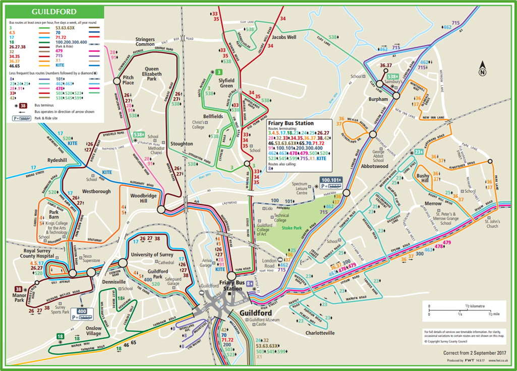 Surrey County Council has a user-friendly and informative webpage with extensive information including timetables and maps, for bus services in Guildford and the surrounding areas, which can be found here. A detailed bus route map is shown below.