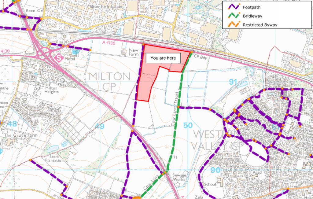 - Footpaths: Valley Park is bordered by a footpath to the west and a bridleway known as Cow Lane to the east. Cow Lane provides access east into Didcot via footpaths/bridleways. The footpath to the west provides access onto the A4130 to the north and Harwell to the south.