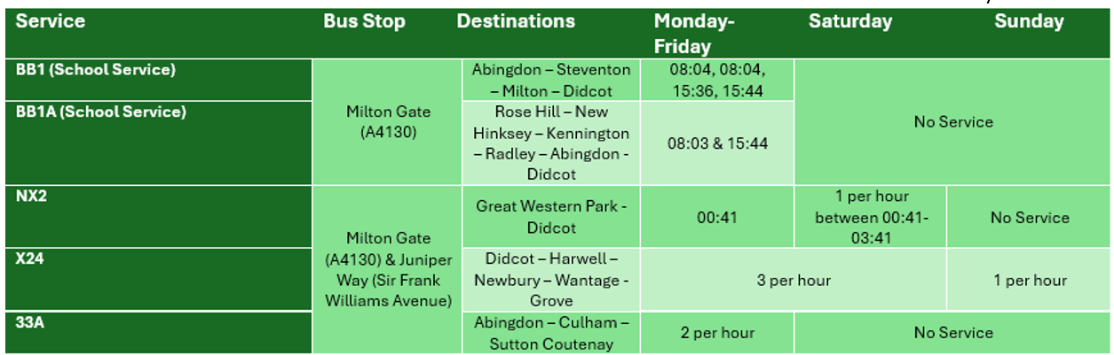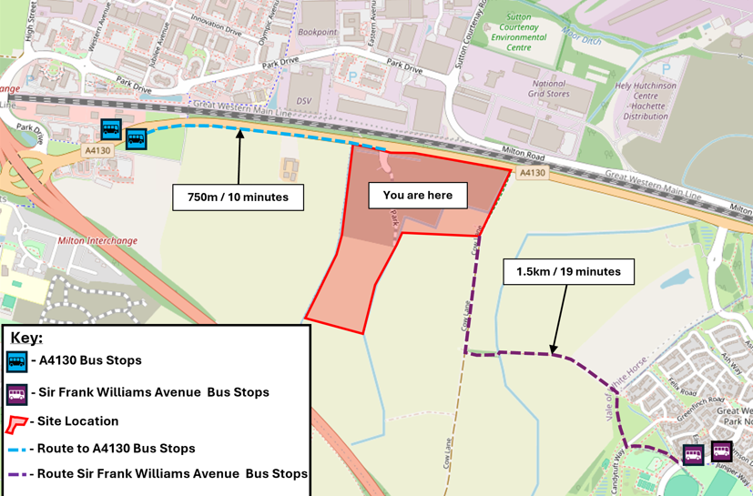 The nearest bus stops to Valley Park are located along the A4130 known as Milton Gate approximately a 10 minute walk. Additional bus stops are located on Sir Frank Williams Avenue approximately a 19 minute walk away.
