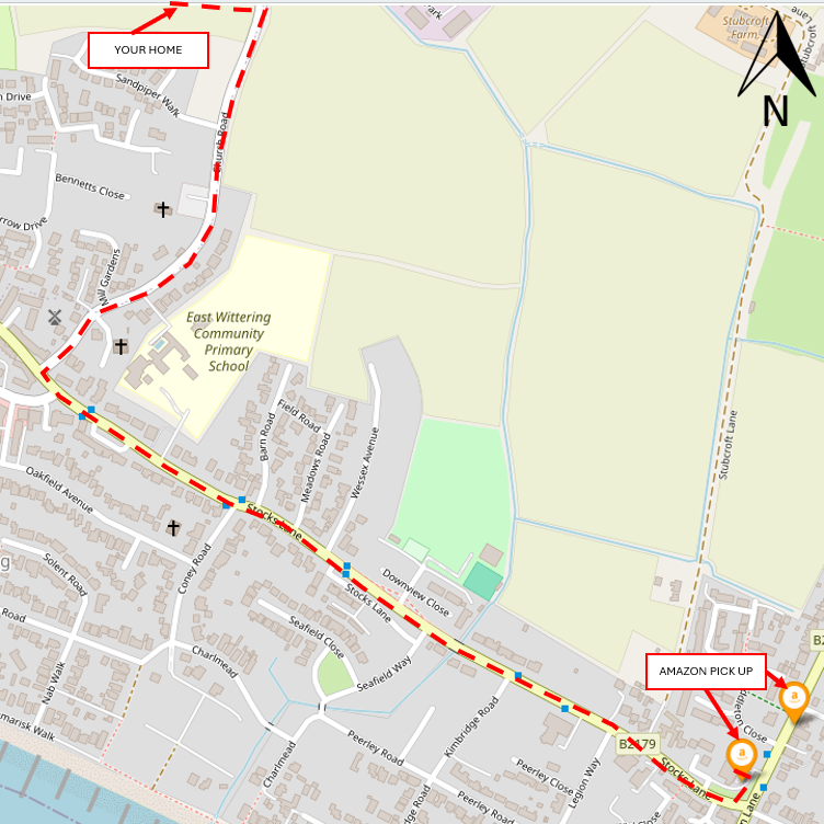 Rather than getting Amazon parcels delivered to your house, you could pick them up from a locker or counter nearby! Your nearest counter is at Co Op food Bracklesham, which is approximately a 24 minute walk or a 6 minute cycle from your home.